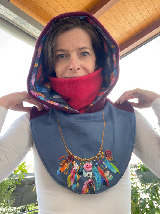 Turtleneck Hood | 'Feathers' | Red and Grey